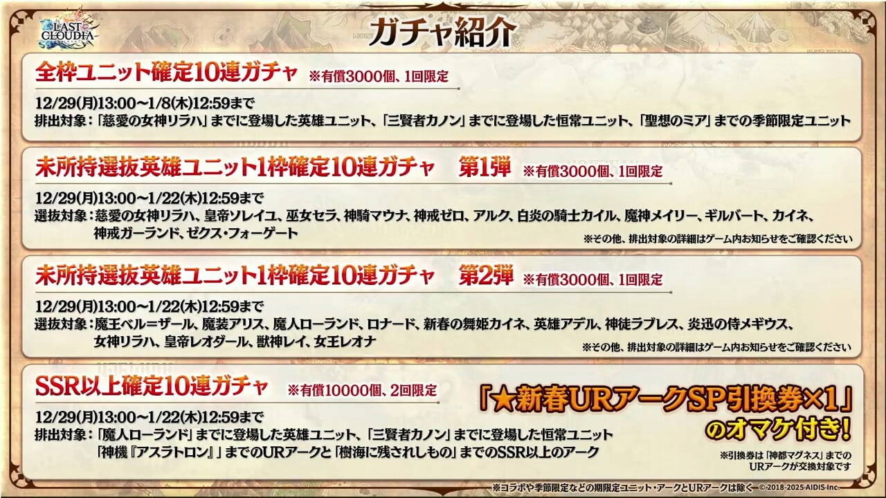 未所持選抜英雄ユニット1枠確定10連ガチャ 第2弾 ※有償 開催期間 2025/12/29(月)13:00~2026/1/22(木)12:59 詳細 - 選抜対象のユニットが1枠確定