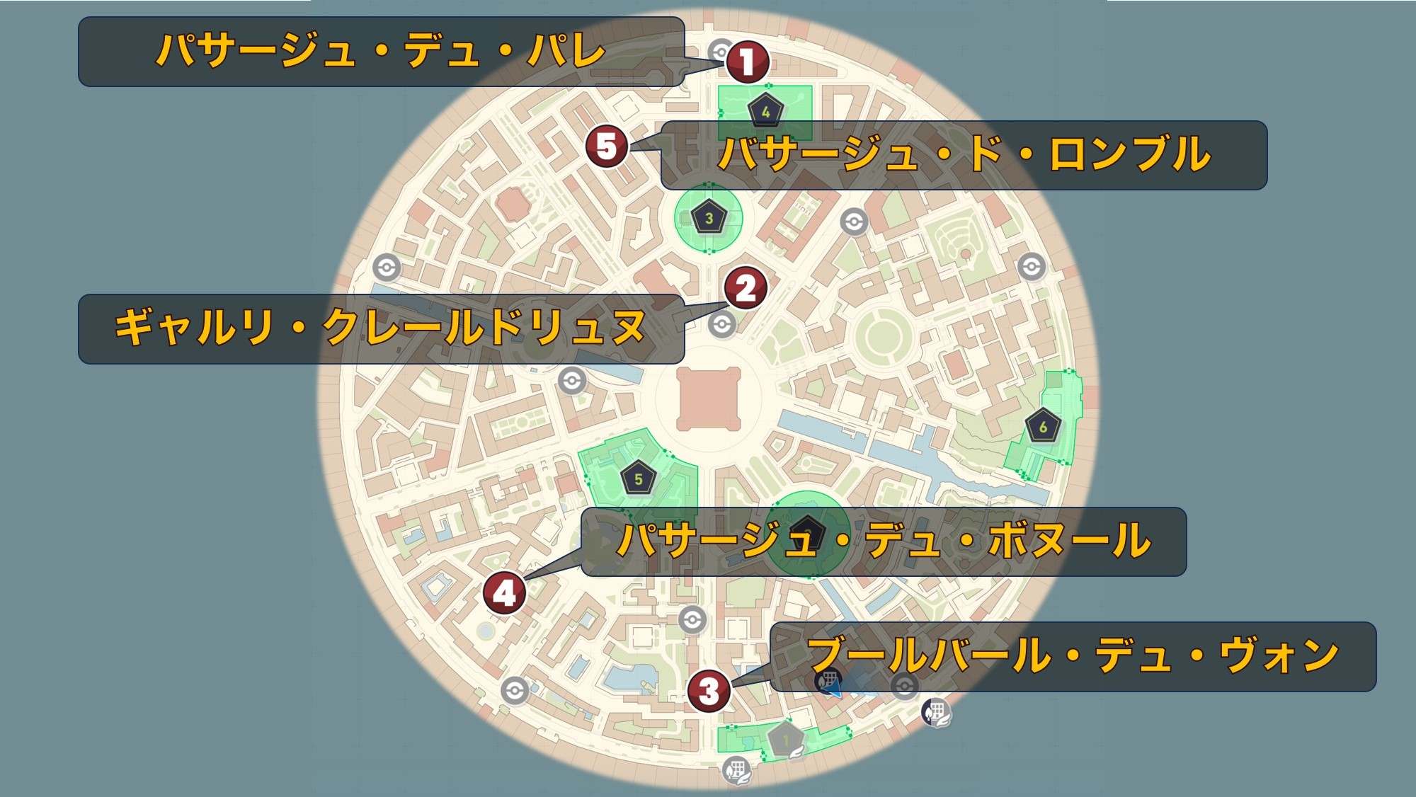 ブティックがまとまっている場所は、ミアレシティに5箇所あります。各マーケットに店舗がまとまっており、合計店舗数は41店舗です。