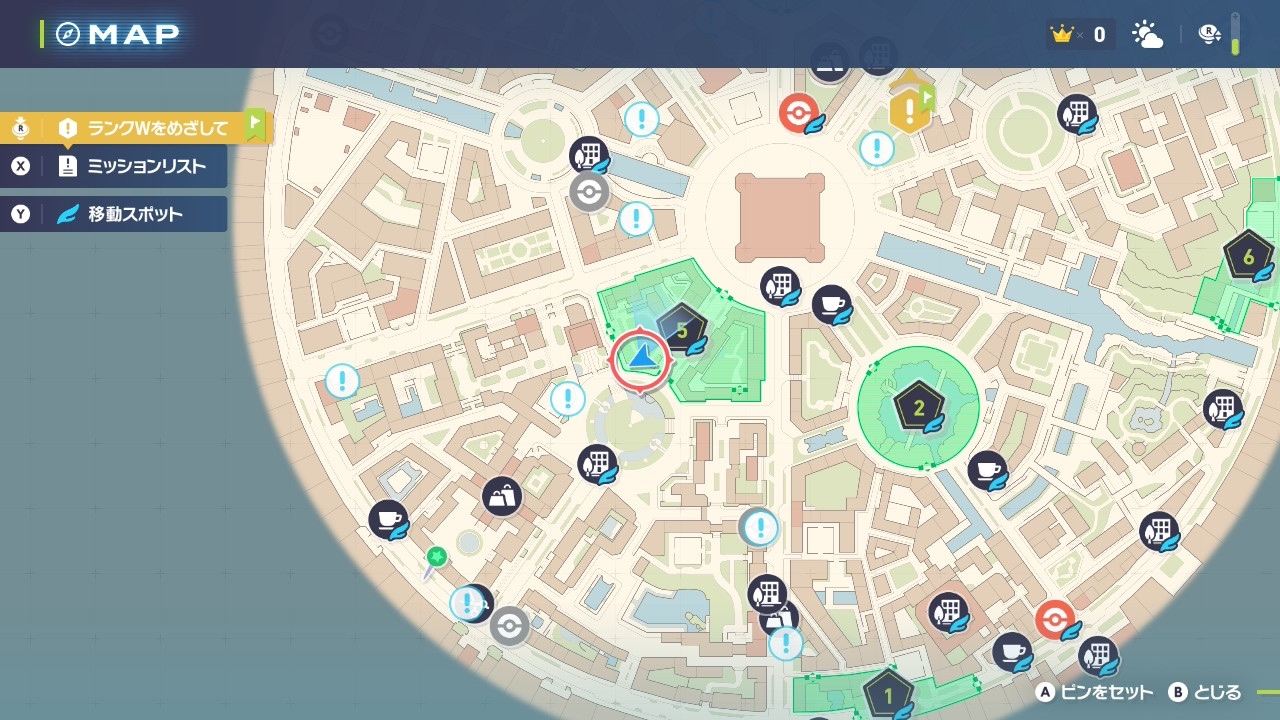 フシデの出現場所マップです。フシデはワイルドゾーン5に出現します。昼夜問わずベンチの近くに出現するので、色違い厳選がしやすいです。