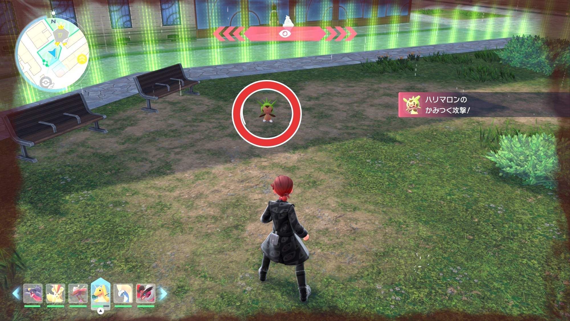 ハリマロンは右奥の建物屋上にいます。ハリマロンの場所には向かわず、ベンチ休憩を繰り返しましょう。色違いのポケモンは、移動やロードを挟むと低確率で出現するので昼→夜ができるベンチを利用します。