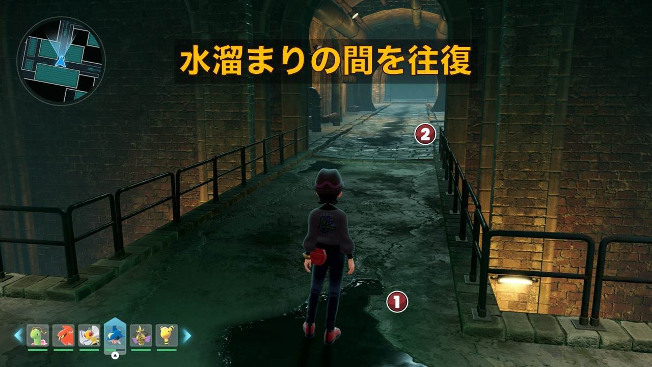 ヒトモシ色違いの厳選は、地下水道で行います。地下水道はストーリーを進めると出現するサイドミッションの「バクーダと新ビジネス」内で入れるようになるので、入れない場合はストーリーを進めましょう。