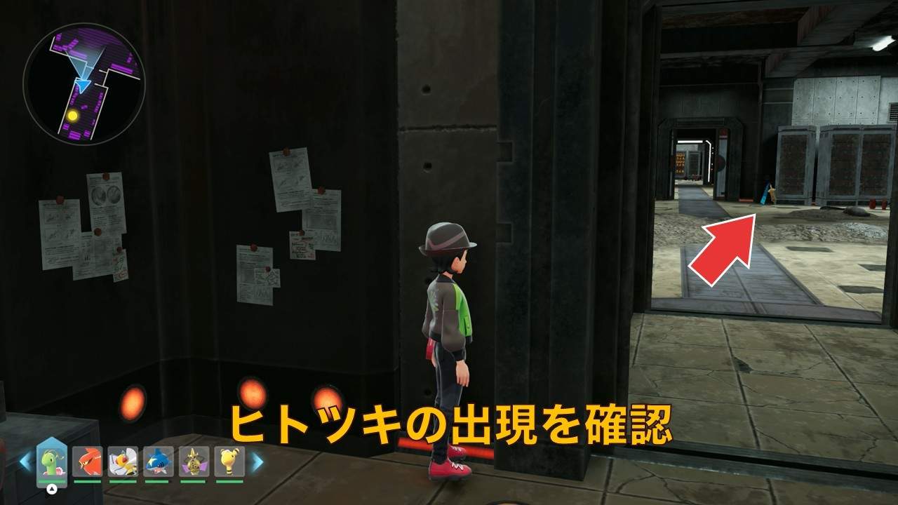 ヒトツキは、フラダリラボのワープ装置を使って色違い厳選するのがおすすめです。フラダリラボのワープ装置を使うと周囲の個体が再抽選されるので、Aボタンを連打してワープを繰り返すと色違い厳選ができます。