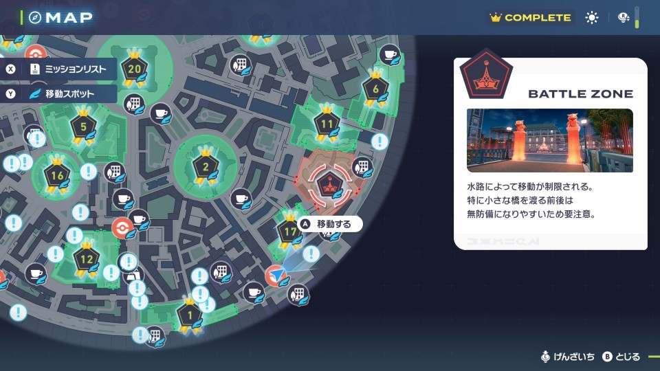 夜に変更したら、厳選したいポケモンが出現するワイルドゾーンの横にバトルゾーンが出現したか確認しましょう。近くに出現してなければ、ベンチで時間変更して横にバトルゾーンが出現するまで繰り返します。