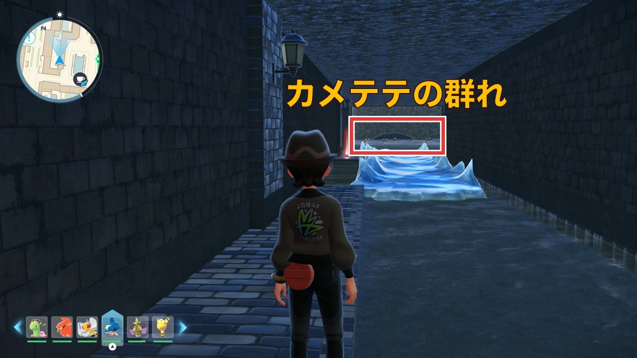カメテテは、ブルー大通りの屋上にあるベンチを使って色違い厳選しましょう。カメテテはのブルー大通りの建物の内側に群れで出現するので、ブルー大通り付近でベンチ休憩を繰り返すと効率良く厳選できます。