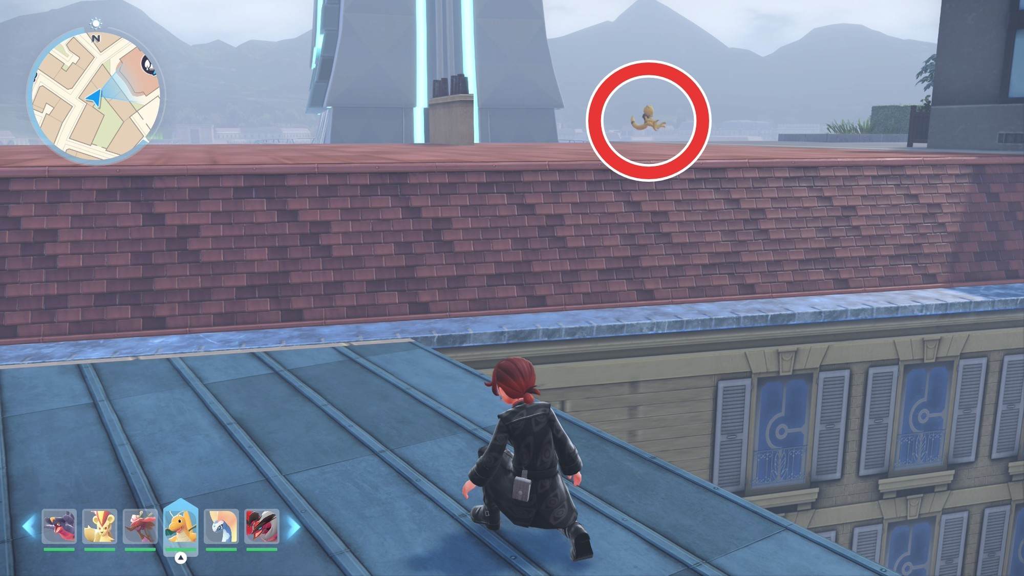 ケーシィは右奥の建物屋上にいます。ケーシィの場所には向かわず、ベンチ休憩をひたすらに繰り返しましょう。色違いのポケモンは、移動やロードを挟むと低確率で出現するので昼→夜ができるベンチを利用します。