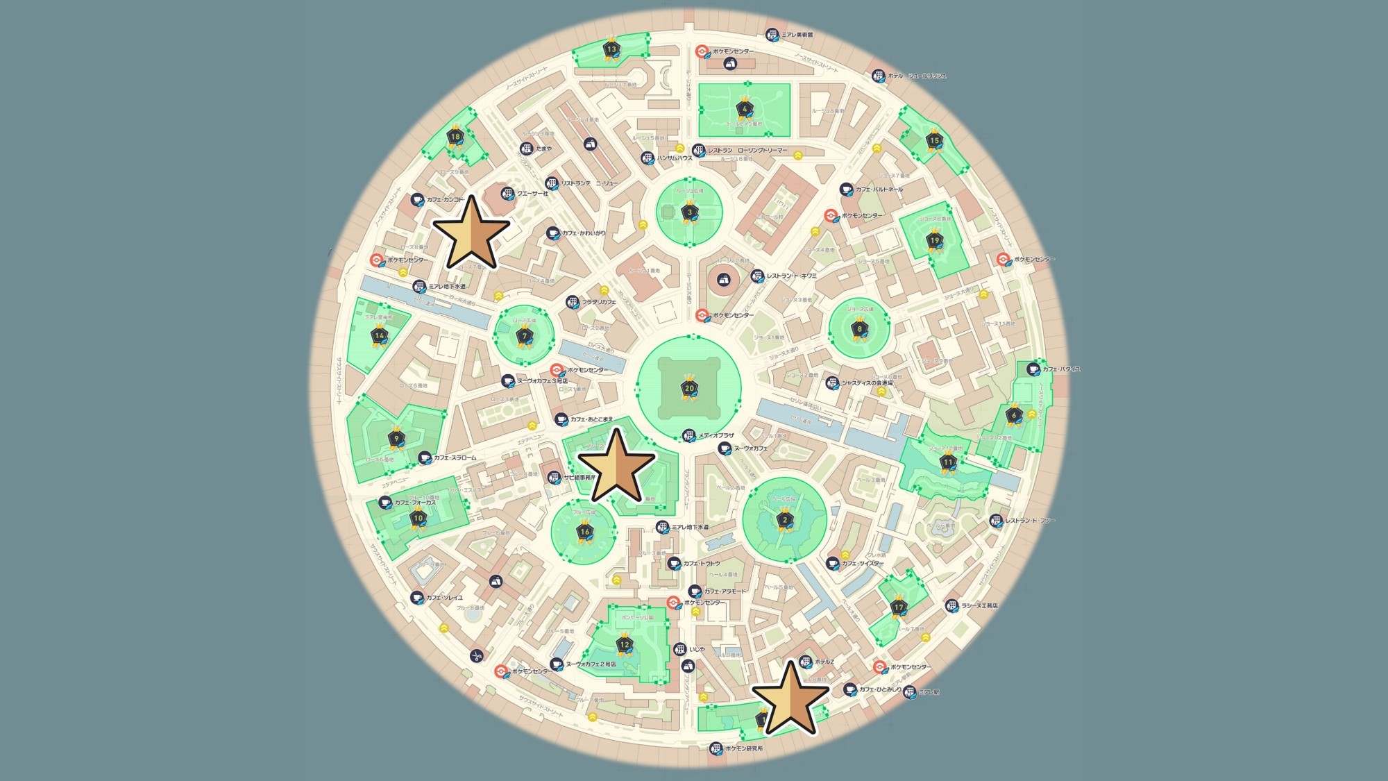 ケーシィの出現場所マップです。星マークが出現場所を表しています。