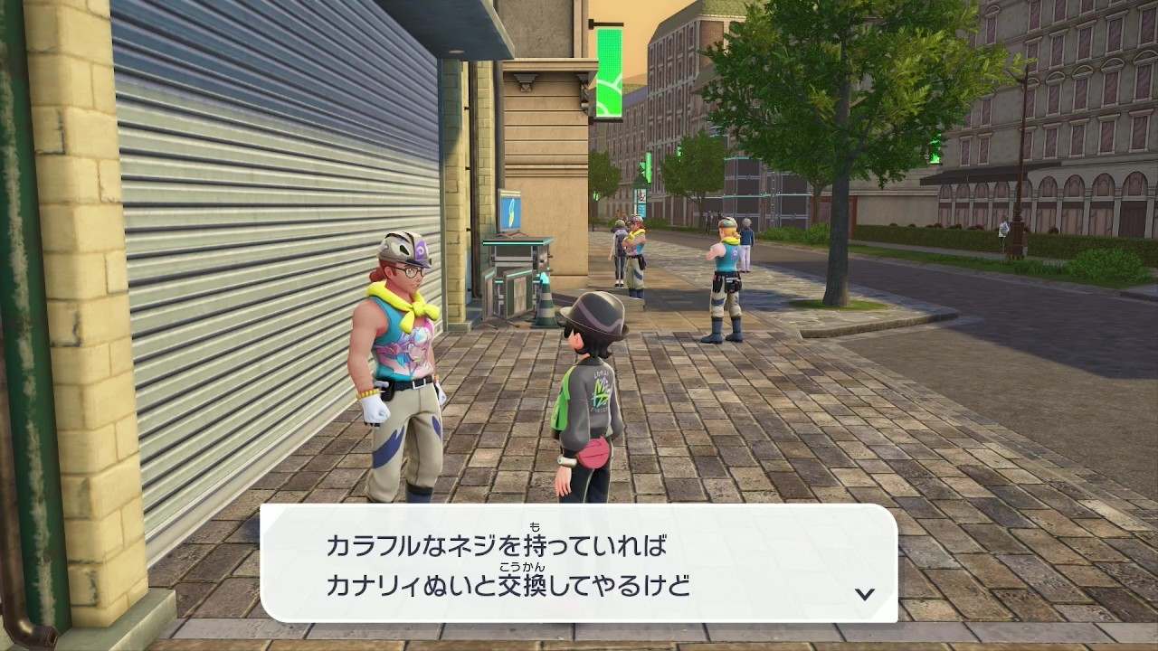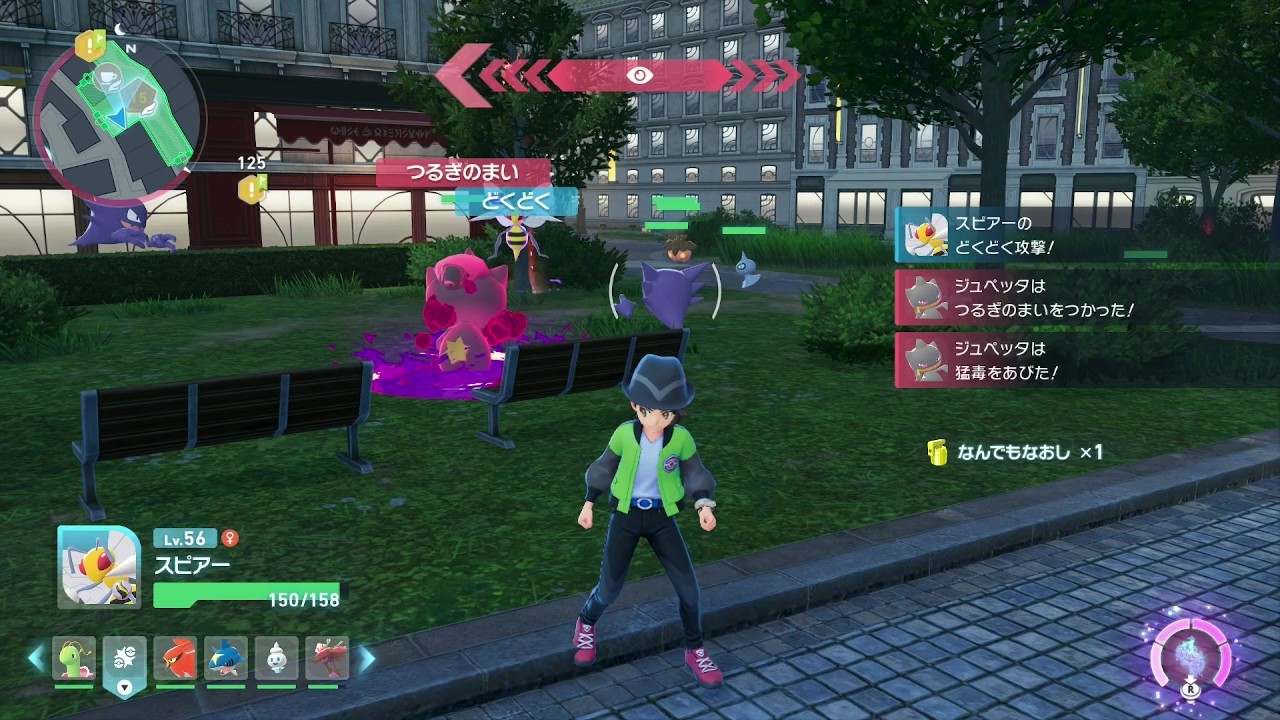 ミアレシティの各地にあるベンチを調べて時間をつぶすと、昼夜を切り替えられます。ベンチはポケモンセンターの横に設置されているため、バトルゾーン周回をする際はポケモンセンターに移動して時間を進めましょう。