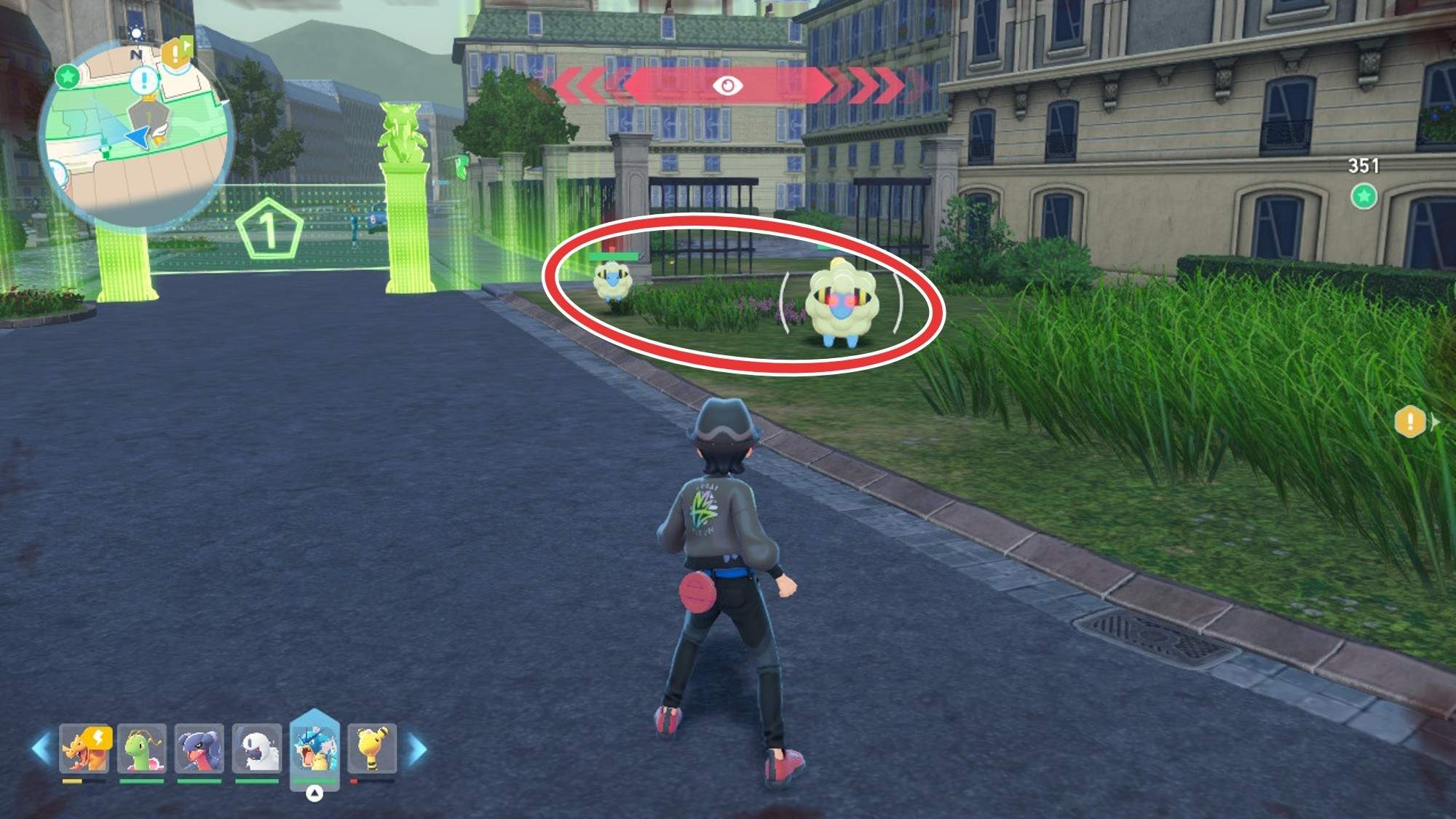 メリープ色違いの厳選をするために、ワイルドゾーン1へ向かいましょう。ファストトラベル側の入口から入り、反対側の入口まで進むと、右側にメリープを確認できます。