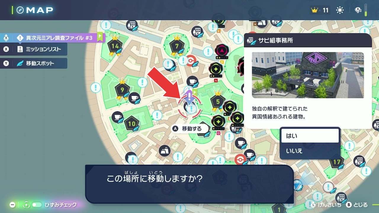 異次元ミアレ調査ファイル#1が開始したら、サビ組事務所へ向かいましょう。カラスバと会話後、異次元のひずみがマップに表示されるようになります。