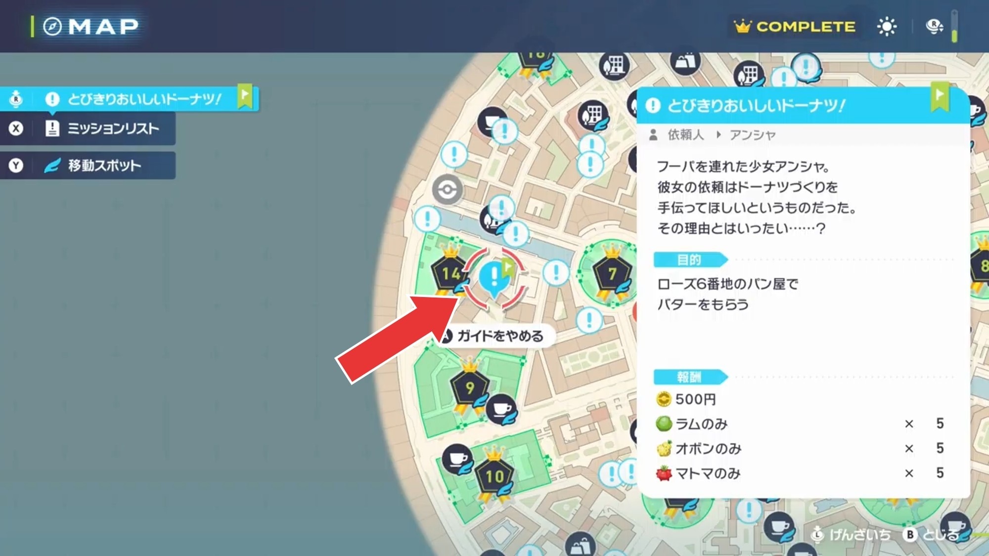 コルニに勝利したら、ルージュ1番地へ向かいましょう。ルージュ1番地では、メガアブソルZとの戦闘が発生するため、異次元きのみを使って高ランクのドーナツを作ってから向かうのがおすすめです。
