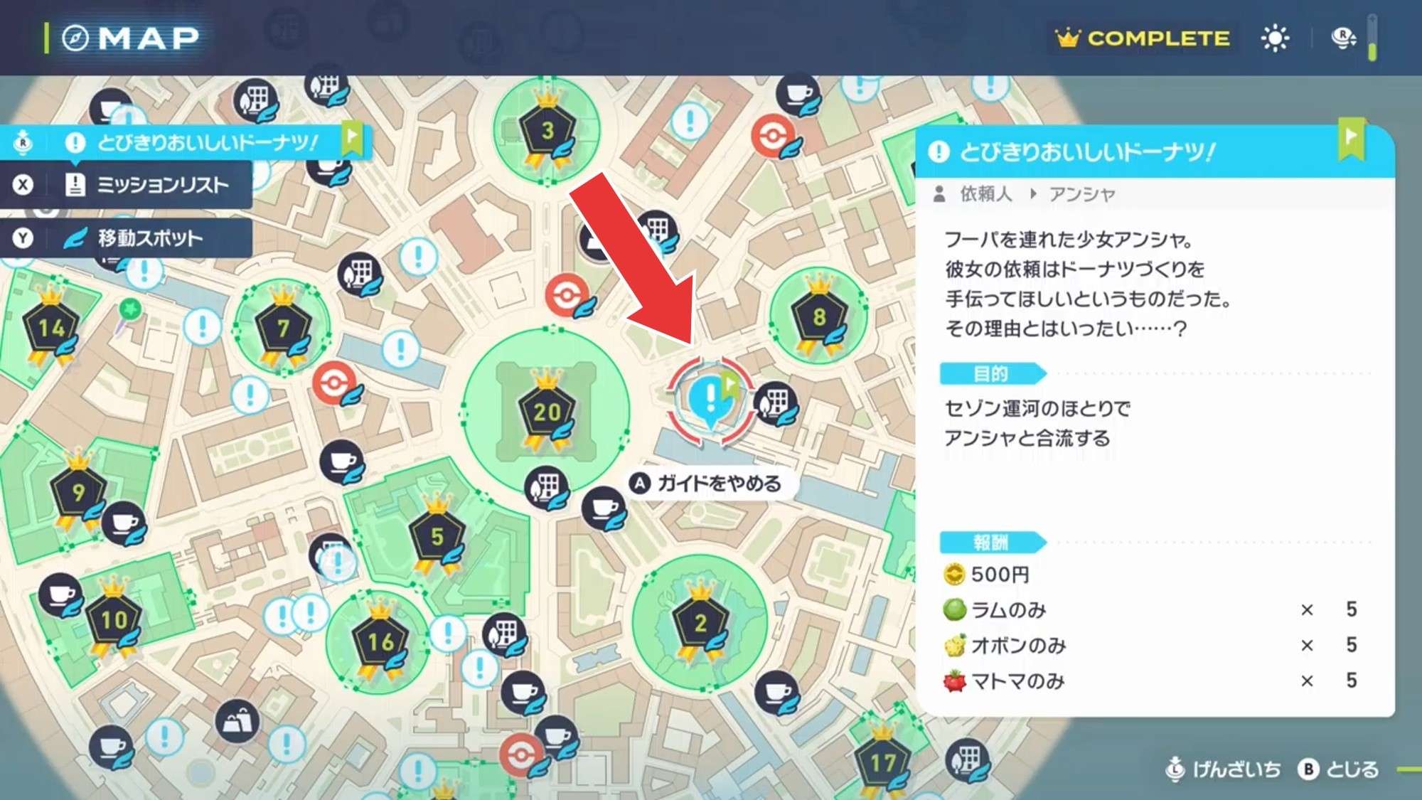 ホテルZに戻ったら、アンシャにきのみ3個を渡してドーナツを作ってもらいましょう。渡したきのみの効果とフレーバーでドーナツの種類が変わりますが、現段階では任意のきのみを渡して問題ありません。