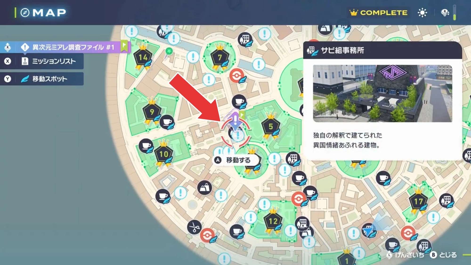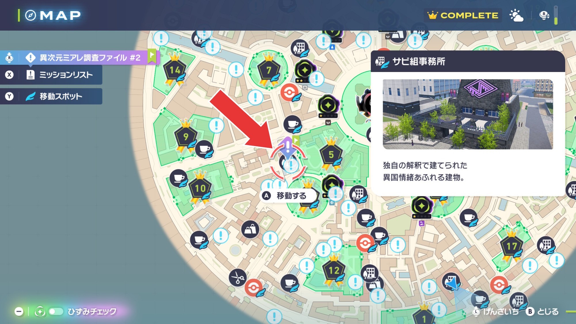 ハルジオとムクに勝利すると、ハルジオ襲来!!がクリアとなり異次元ミアレ調査ファイル#2が発生します。サビ組事務所へ向かい、カラスバと会話しましょう。
