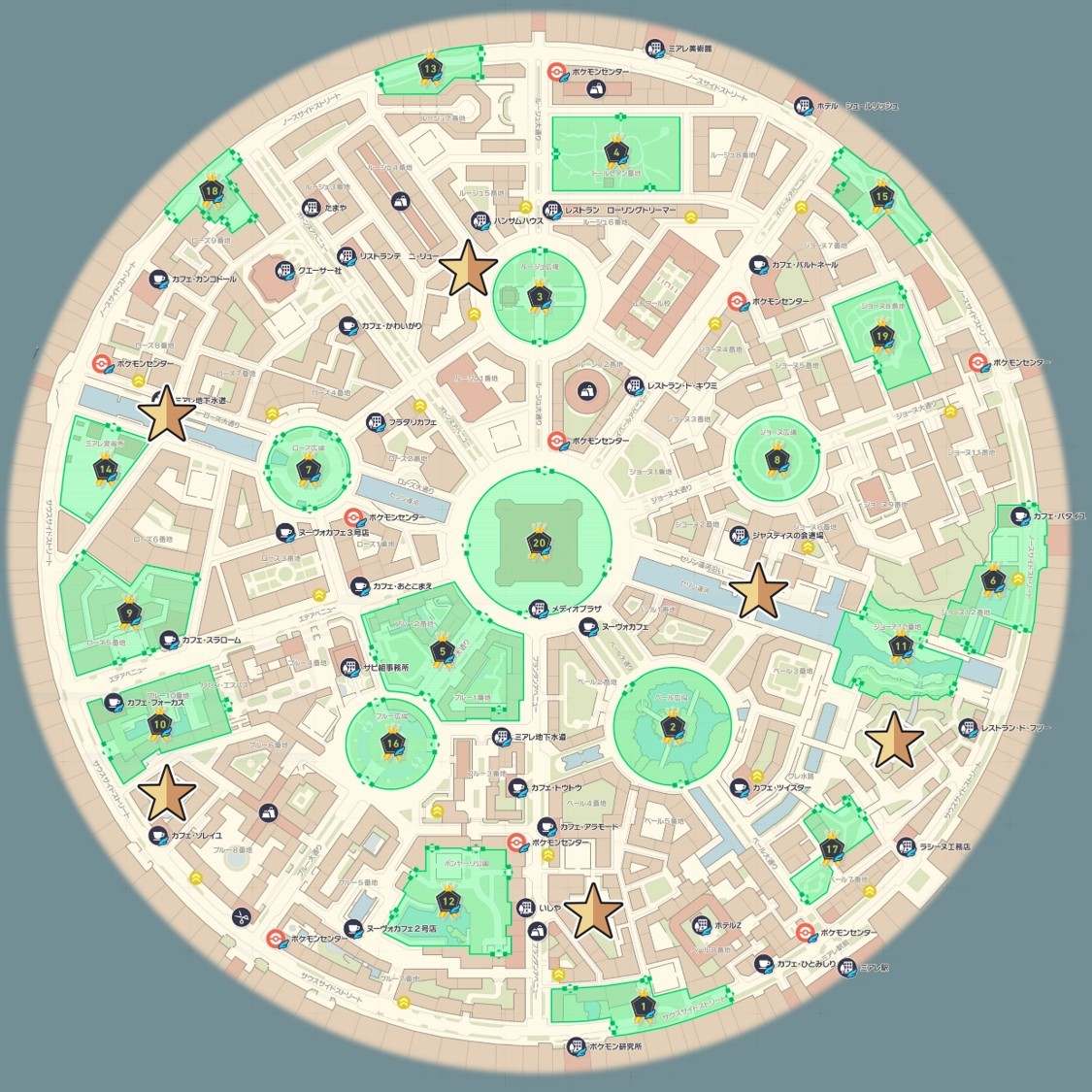 ヌメラの出現場所マップです。星マークが出現場所を表しています。なお、雨であればピン以外の範囲でもヌメラは出現する可能性があります。