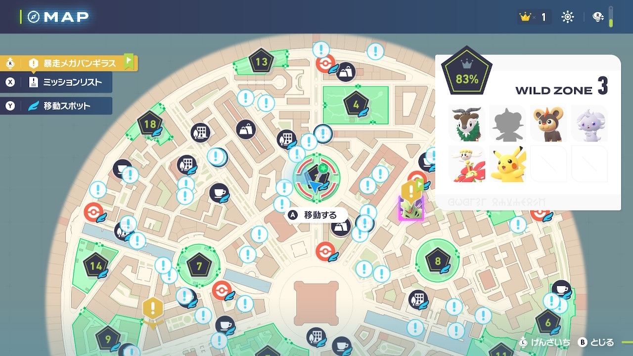 ピカチュウは、出現した状態でロードを挟んでも消えないので、建物で出入りを何度か繰り返した後に目視で確認するのがおすすめです。なお、ピカチュウはワイルドゾーン3の南東エリアにいます。