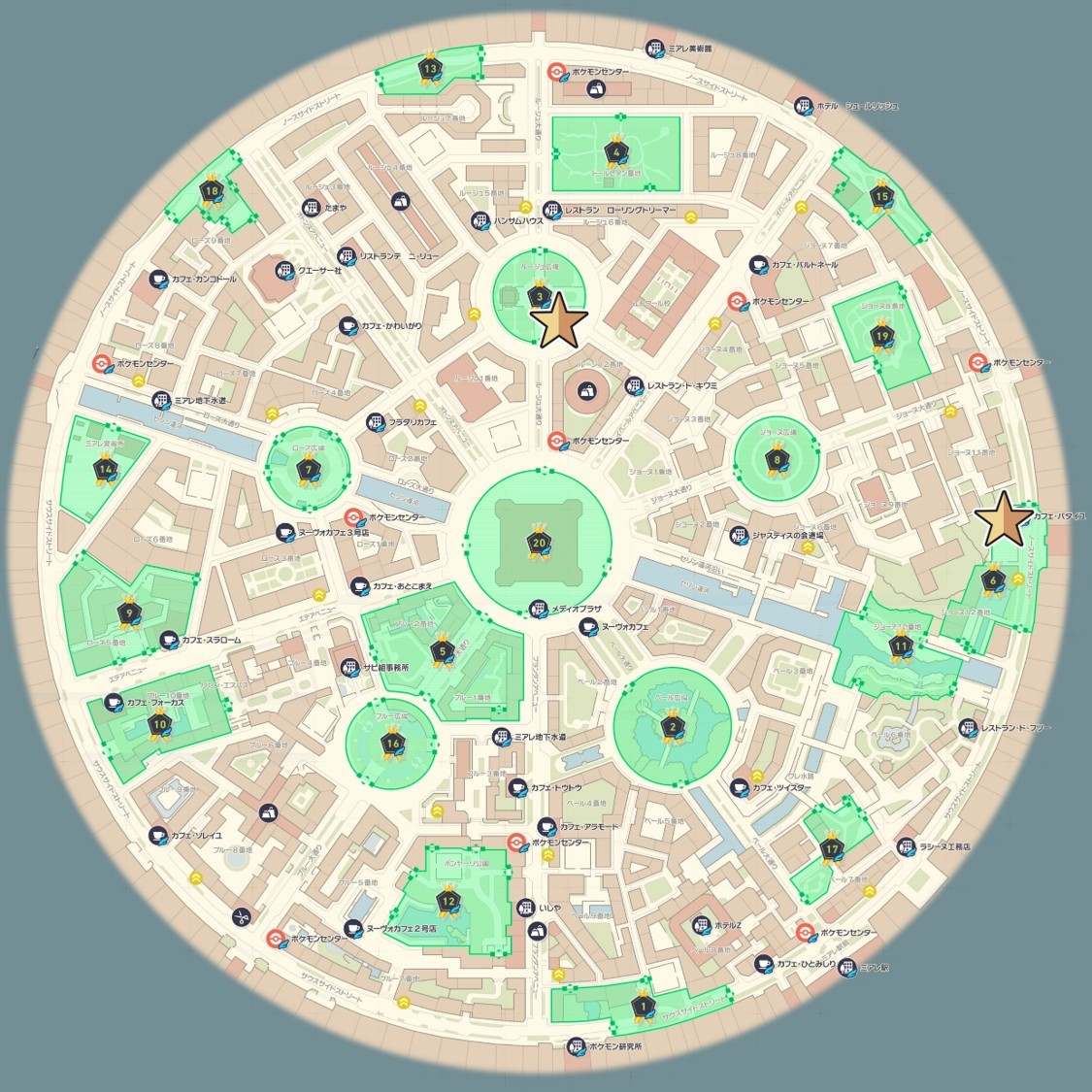 ピカチュウの出現場所マップです。星マークが出現場所を表しています。