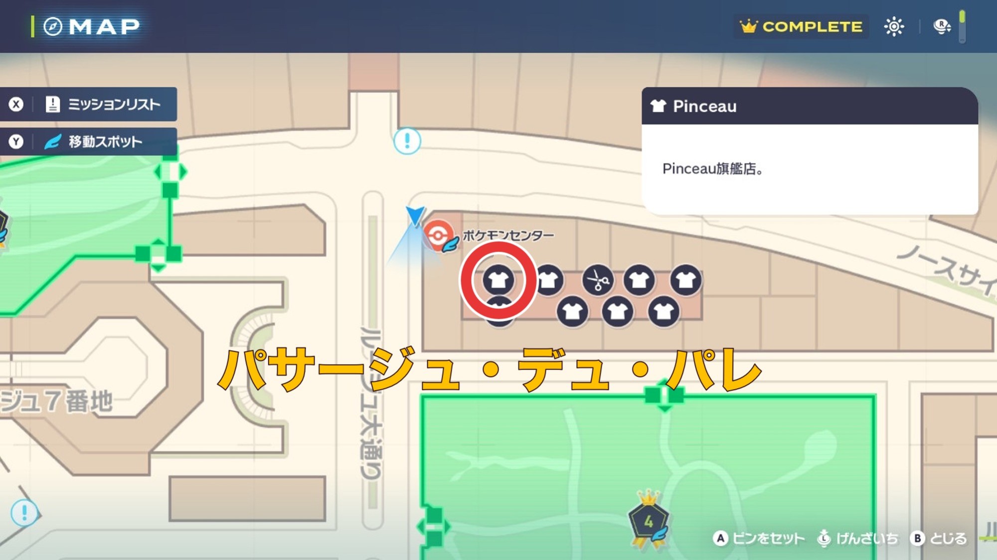 pinceauはパサージュ・デュ・パレの中にあります。ルージュ大通りのポケモンセンターにワープすればすぐに立ち寄ることが可能です。