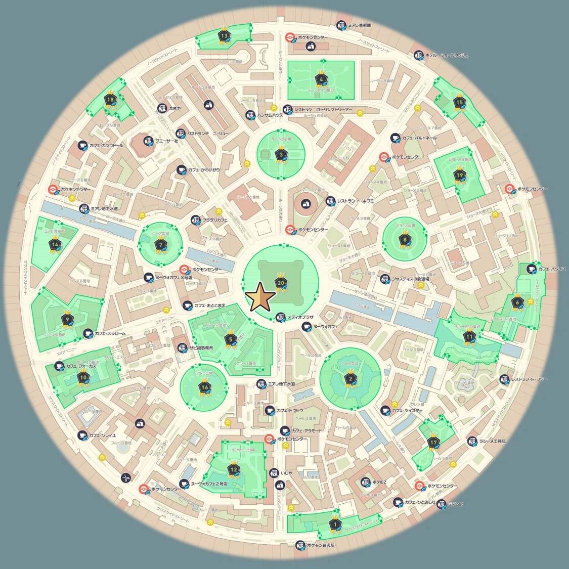 ポカブ色違い厳選の際は、メディオプラザに移動します。直接ワイルドゾーン20に移動すると、南東のゲート前から始まるので厳選場所の南ゲートにメディオプラザから移動しましょう。