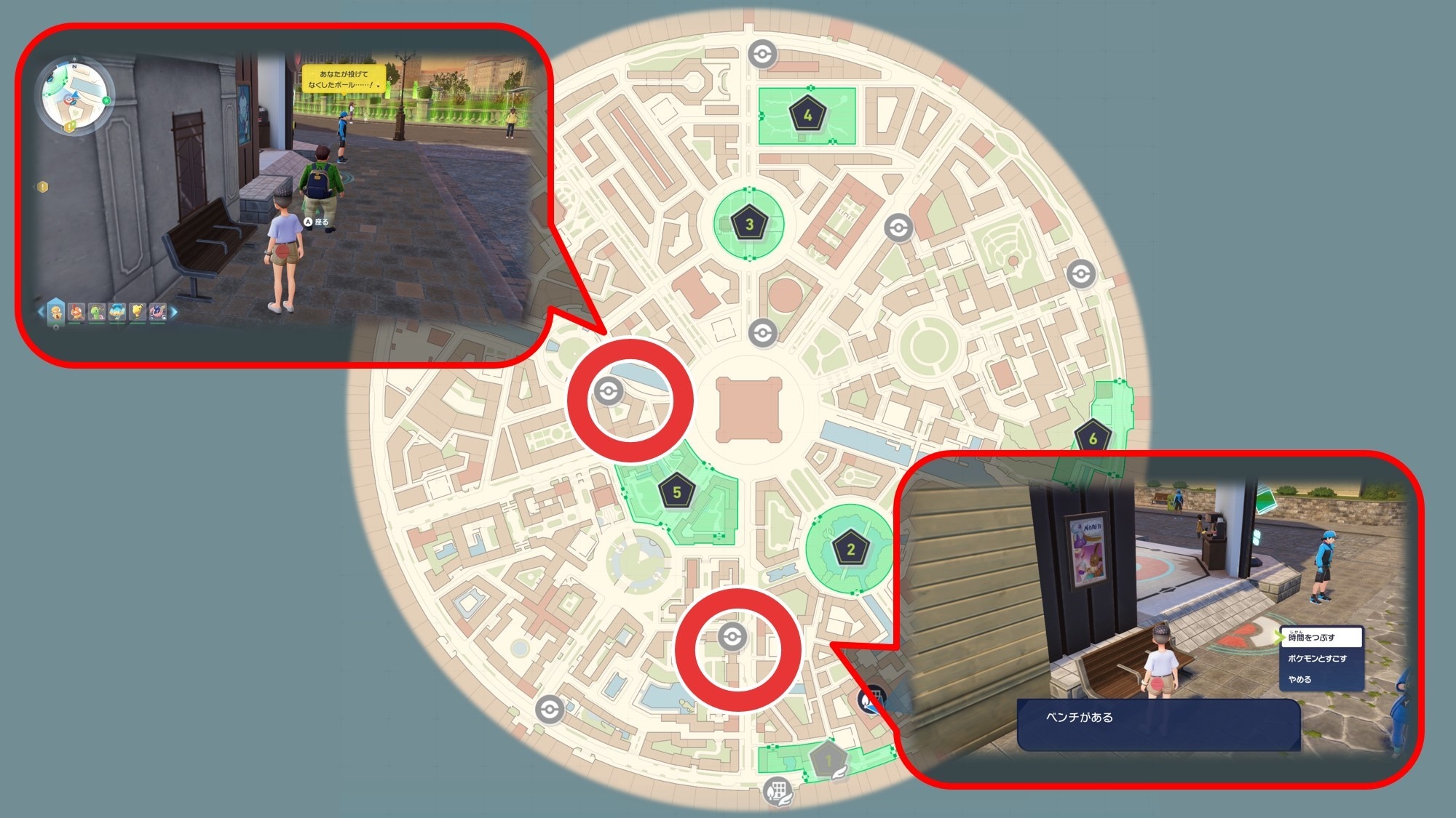 また、ベンチの場所はポケモンセンターの付近がおすすめです。ファストトラベルで移動できて、すぐに利用できます。