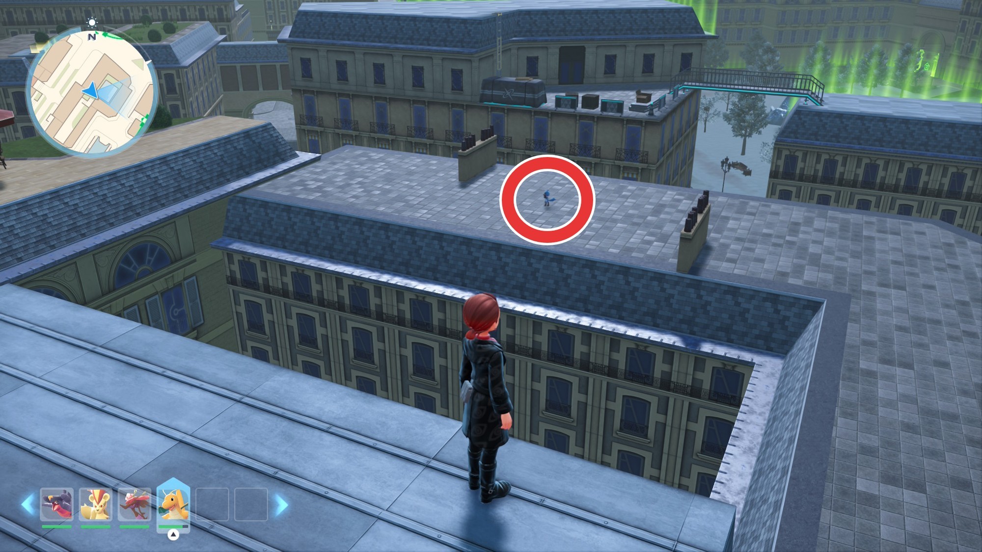 リオルは左の建物屋上にいます。リオルの場所には向かわず、ベンチ休憩をひたすらに繰り返しましょう。色違いのポケモンは、移動やロードを挟むと低確率で出現するので昼→夜ができるベンチを利用します。