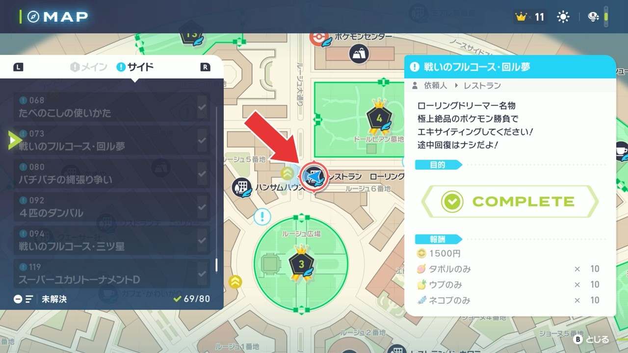 サイドミッションでタポルのみを貰えるのは、クリア時の1度きりです。複数準備するなら、きのみショップで購入しましょう。