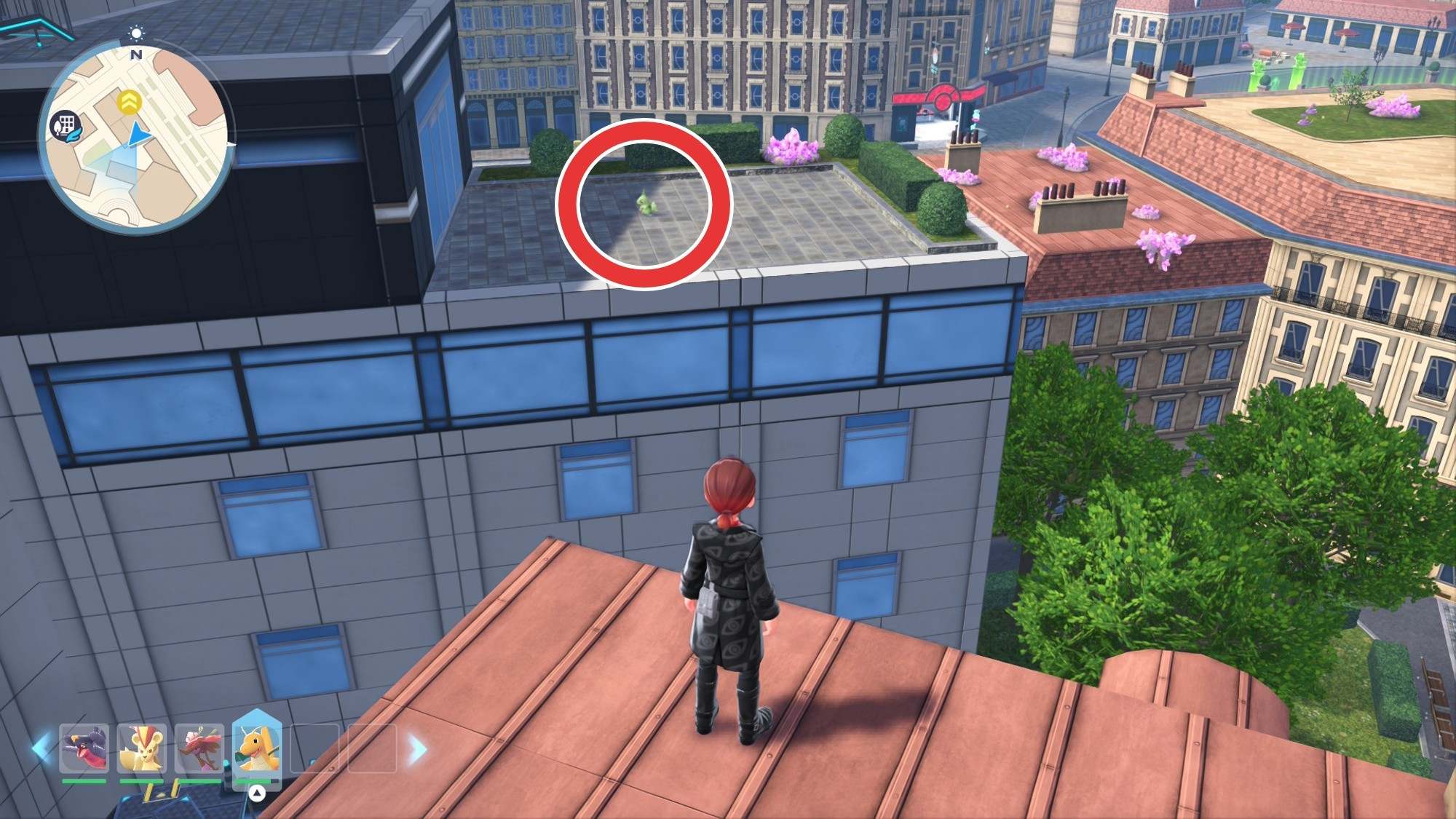 ヨーギラスは右奥の建物屋上にいます。ヨーギラスの場所には向かわず、ベンチ休憩を繰り返しましょう。色違いのポケモンは、移動やロードを挟むと低確率で出現するので昼→夜ができるベンチを利用します。