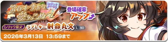 レリック射命丸文ガチャでは「ラブレター 射命丸文(L80)」の登場確率がアップしています。また、MVアンソロジー絵札の「想いを手紙に託して」も登場し、交換P50との交換でのみ入手できます。