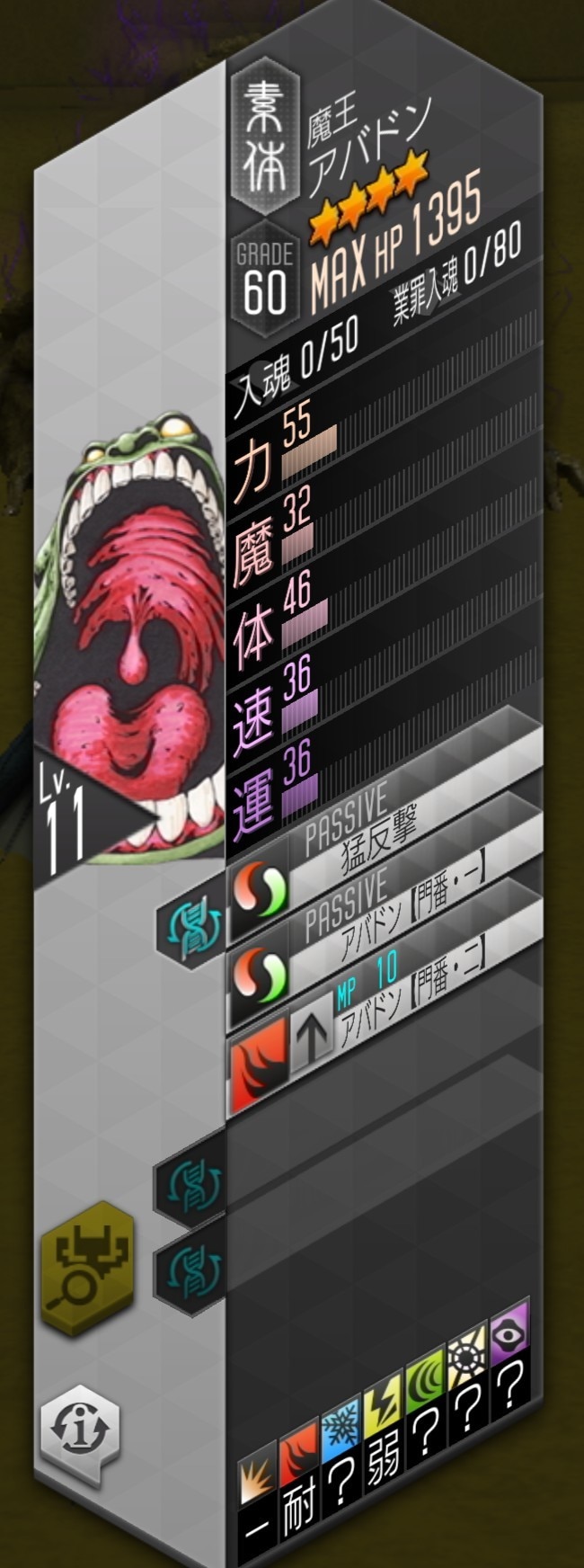 7層のボスは、電撃属性が弱点なので、電撃属性スキルを持つ悪魔を編成しましょう。ただし、従来のアバドンと同様に、打撃型攻撃時に反撃を受けるので、等倍でも魔法型攻撃スキルを発動して戦うのがおすすめです。