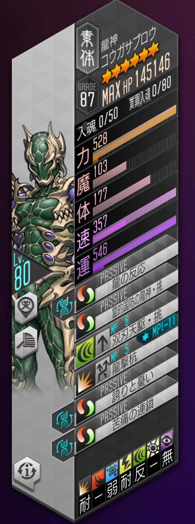 - 敵ターン開始時、連動効果「敵のプレスターンアイコンを2つ減少させる。」(1ターン中1回まで)自身が弱点を突かれたとき、連動効果「自身を消沈状態にする。」