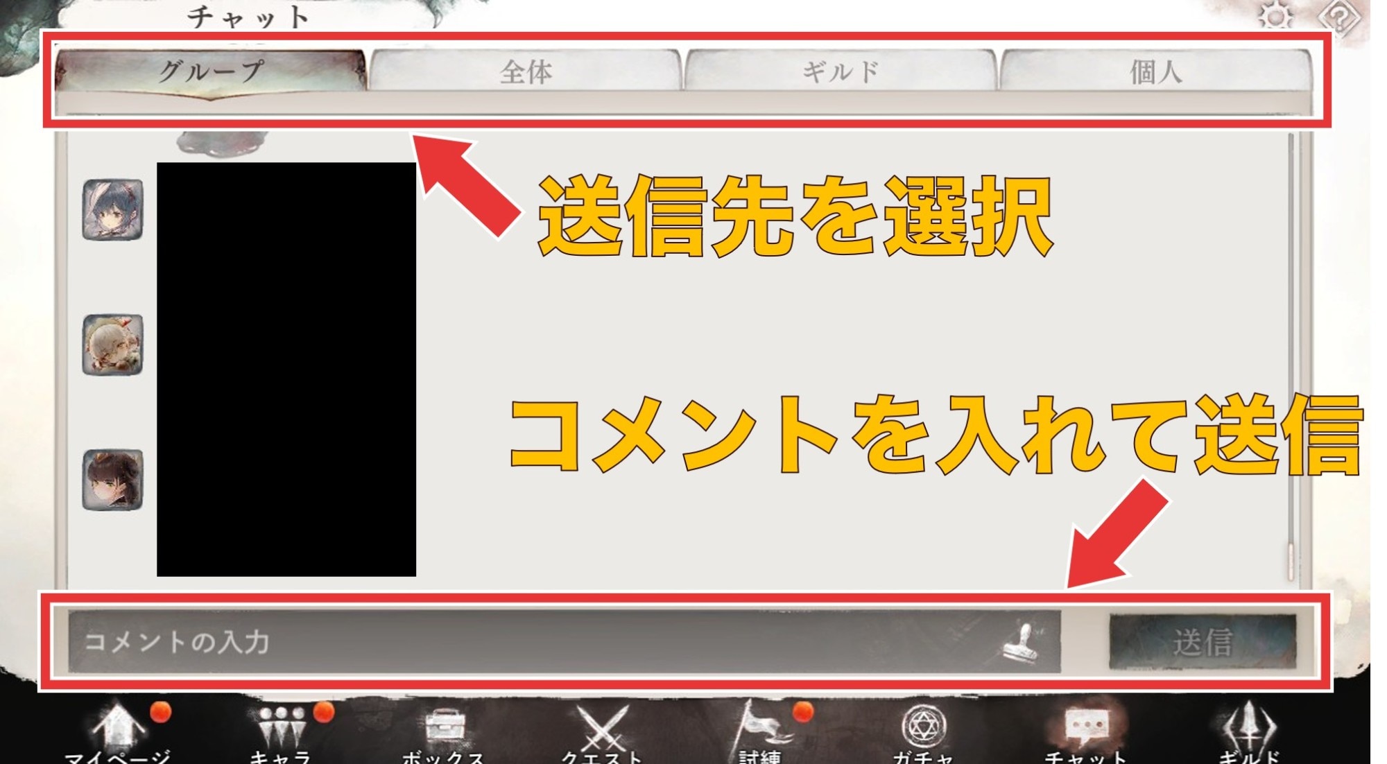 個人チャットは、特定のプレイヤーに対してチャットを送れます。個人的に連絡したいことやギルドへの引き抜きなど、秘密裏に事を進めたい時に活用するのがおすすめです。