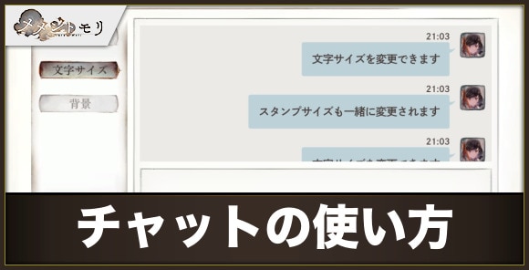 メメントモリ(メメモリ)のチャットの使い方をご紹介。チャットの種類や設定、スタンプについて記載しています。