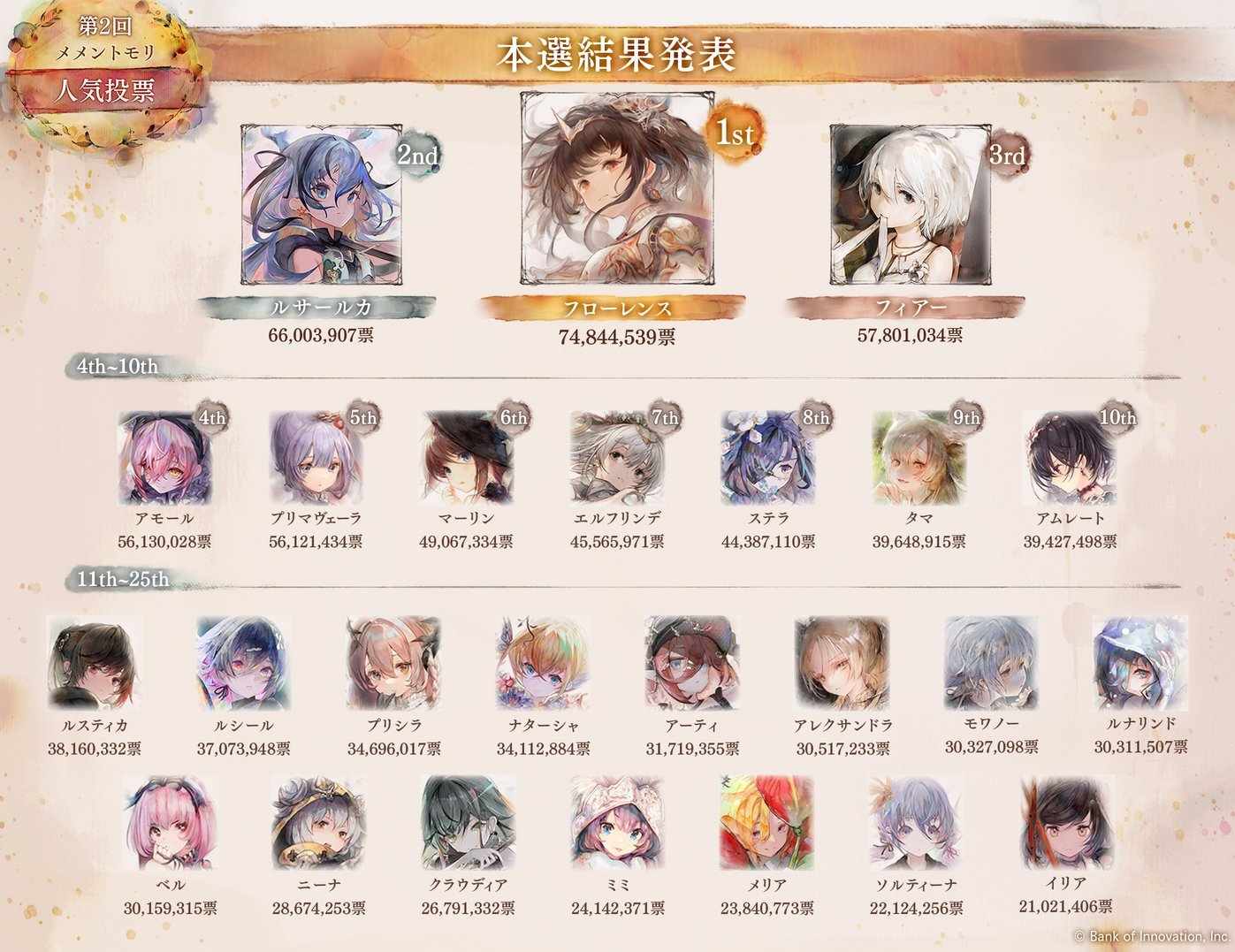 また2位に輝いたのはルサールカ、3位に輝いたのはフィアーでした。1~3位になったフローレンス、フィアー、ルサールカは、チャットスタンプ化が予定されています。