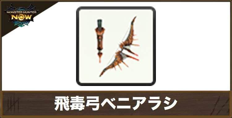 モンハンNow(モンハンナウ)の飛毒弓ベニアラシ1の性能と強化素材を紹介。グレード別の攻撃力はもちろん、装備スキルも記載しています。生産素材とグレード別の強化素材もまとめているので、飛毒弓ベニアラシ1を装備する際の参考にしてください。