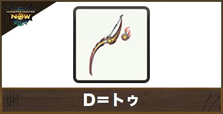 モンハンNow(モンハンナウ)のD=トゥ1の性能と強化素材を紹介。グレード別の攻撃力はもちろん、装備スキルも記載しています。生産素材とグレード別の強化素材もまとめているので、D=トゥ1を装備する際の参考にしてください。