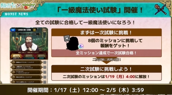 一級魔法使い試験が開催。一級魔法使い試験では、ミッションをクリアすると報酬が入手でき、一次試験をすべてクリアで二次試験に挑戦できます。二次試験は1月19日(月)4時に解放されるため、それまでに一次試験をクリアしておきましょう。