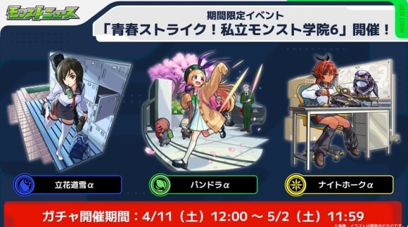 期間限定イベント「私立モンスト学院6」が開催!星6キャラ「立花道雪α」「ナイトホークα」「パンドラα」がガチャで初登場します。