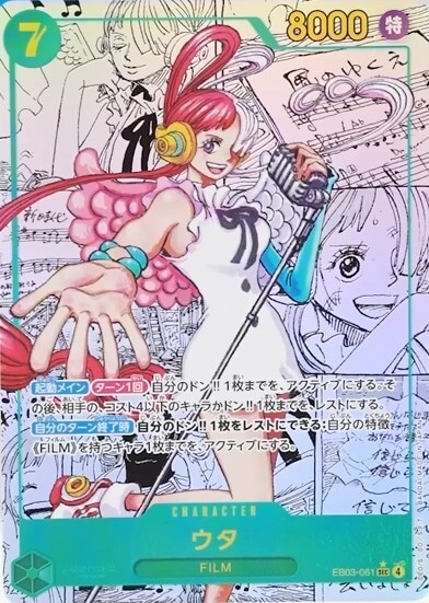 ワンピースカード(ワンピカード)のウタ(EB03-061)の買取価格相場と価格推移をまとめています。ウタ スーパーパラレルの今後の高騰予想や入手方法も紹介しています。