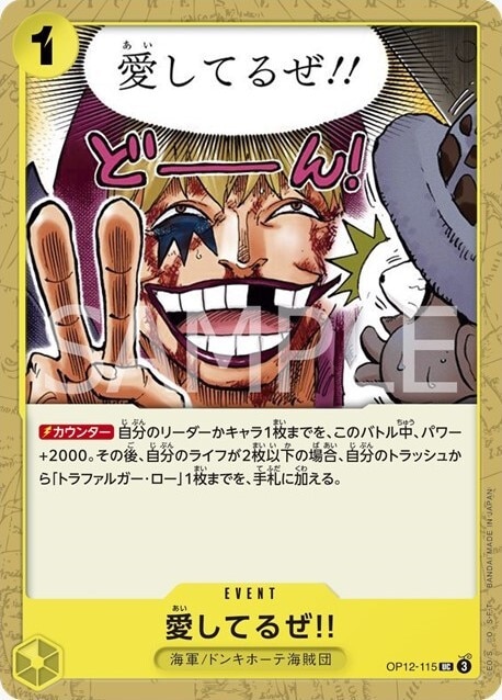 | レアリティ | ・リーダーカード:6種 ・コモン:45種 ・アンコモン:30種 ・レア:26種 ・スーパーレア:10種 ・シークレットレア:2種 ・スペシャルカード:6種 ・3周年スペシャルカード:2種 ・ドン!!カード:1種 |