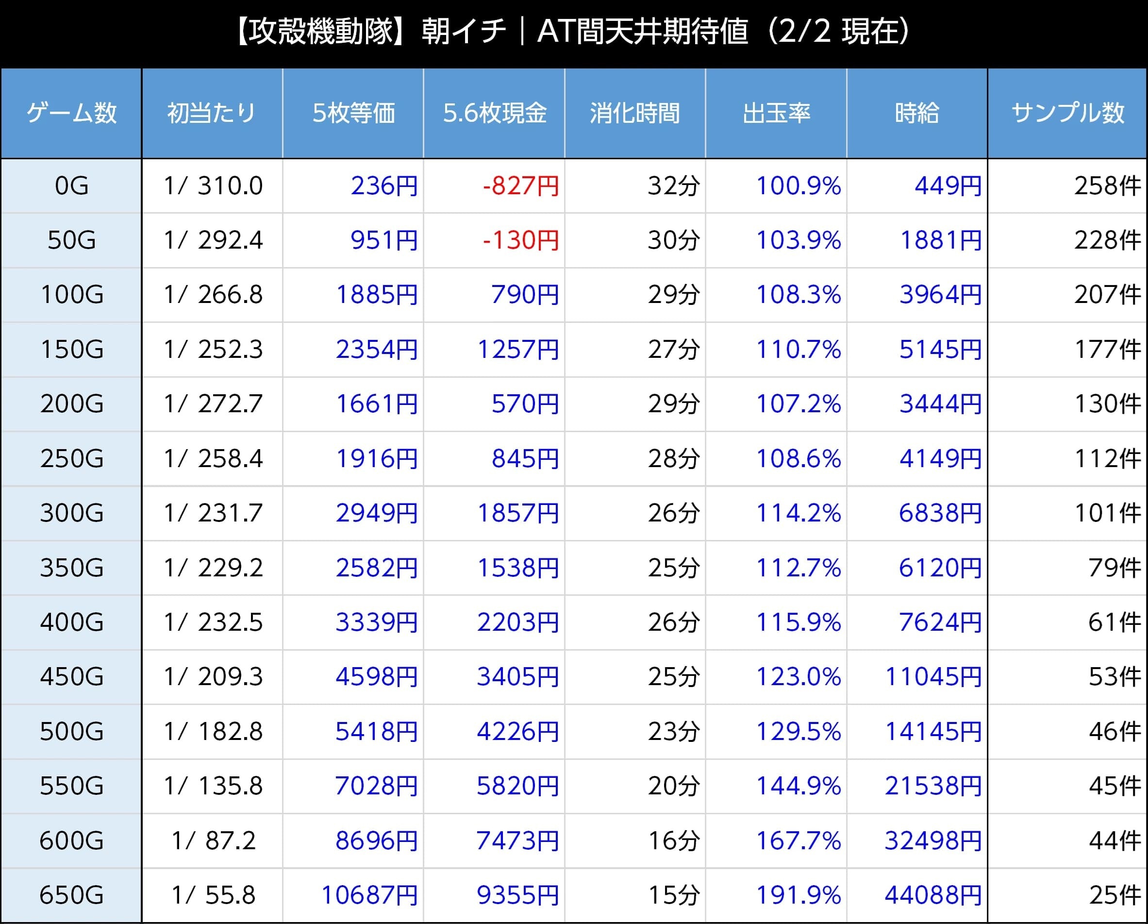 | G数 | 初当たり | 5.0等価 | 5.6現金 | 出玉率 |