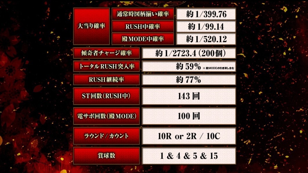 | 大当たり時振り分け | LT(RUSH)突入:50.1% 殿モード(時短)突入:49.9% |