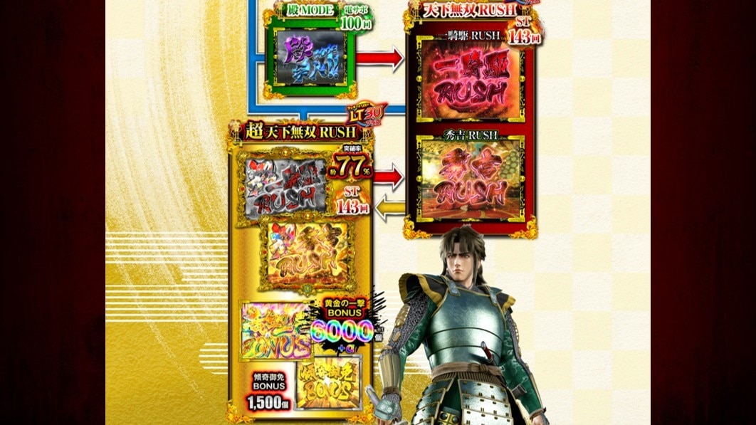 | 振り分け | 【超天下無双RUSH突入】 ・18.6% ※3,000玉 ・4.9% ※1,500玉 【RUSH継続】 ・31% ※3,000玉 ・45.5% ※1,500玉 |
