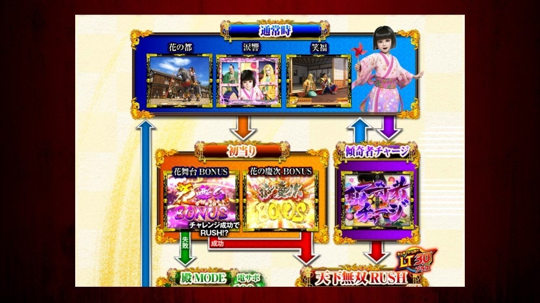 | 殿MODE | キャラ分岐時 | 抽選条件:キャラ分岐のホワイトアウト時にボタンPUSH 結果:ドット慶次が液晶上に登場+登場音+ボタンバイブでRUSH突入濃厚 |