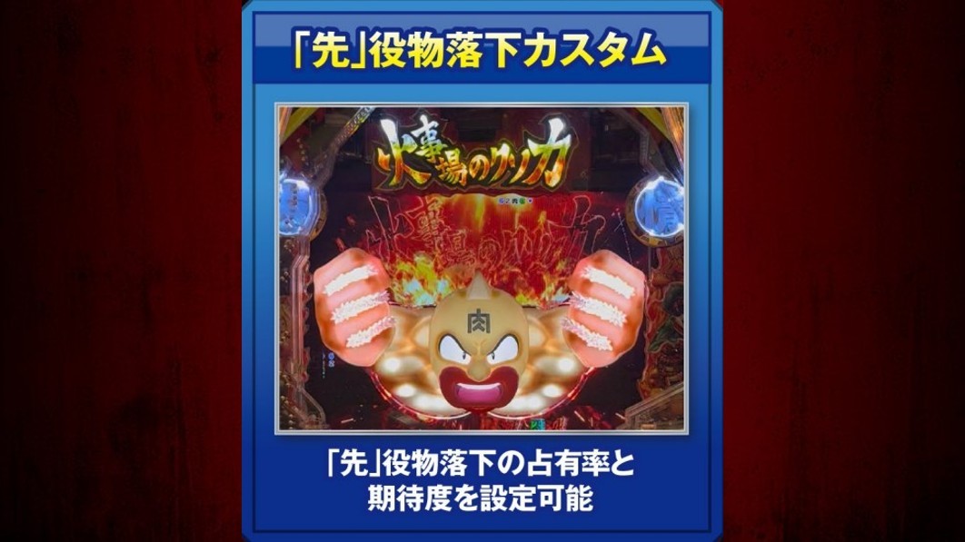 キン肉マンパチンコの「先」役物落下カスタムは、保留入賞時に役物が落下する先バレカスタムです。カスタムごとに信頼度が異なるので、自分好みのカスタムを設定しましょう。