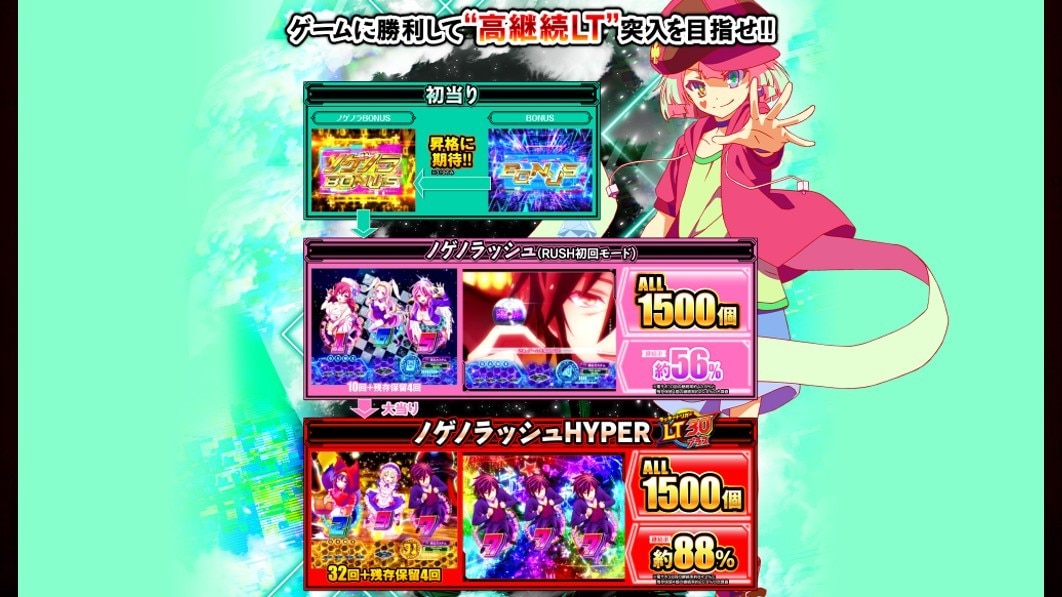 ノゲノラ パチンコのパチンコのスペック解説と演出信頼度のまとめです。スペック別のLT(ラッキートリガー)の突入率や継続率、獲得期待出玉についても記載しています。