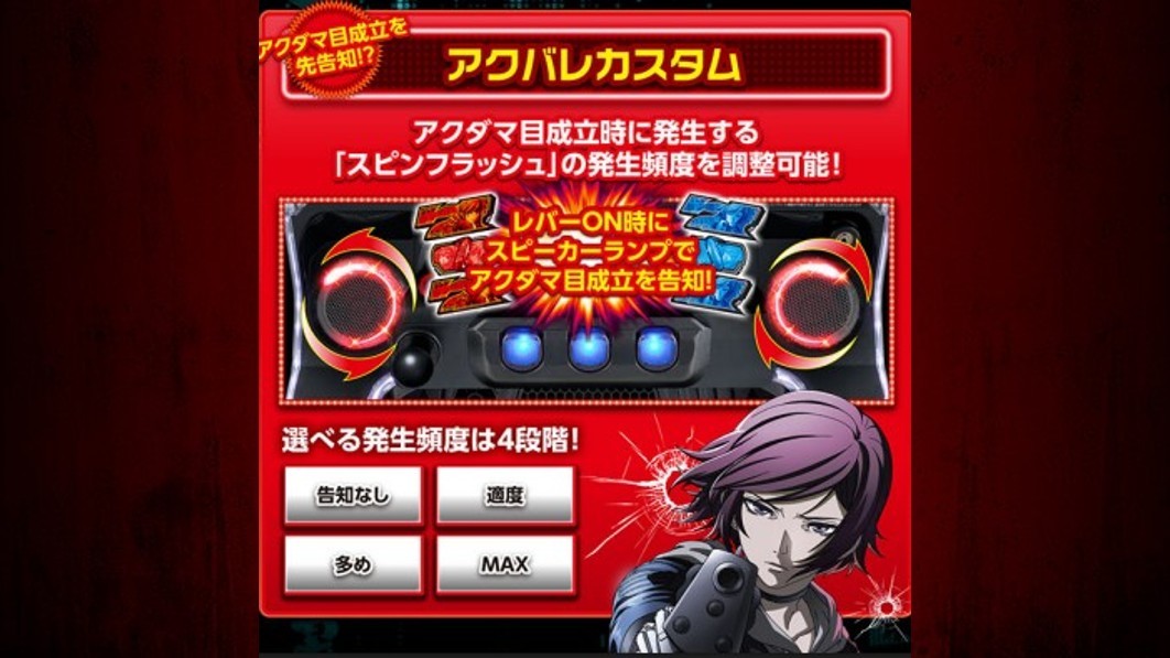 アクダマドライブスマスロのアクバレカスタムは、アクダマ目成立時に発生するスピンフラッシュ(スピーカーランプ点灯)の発生頻度を調整できます。アクダマ目成立を先に知りたい人におすすめです。