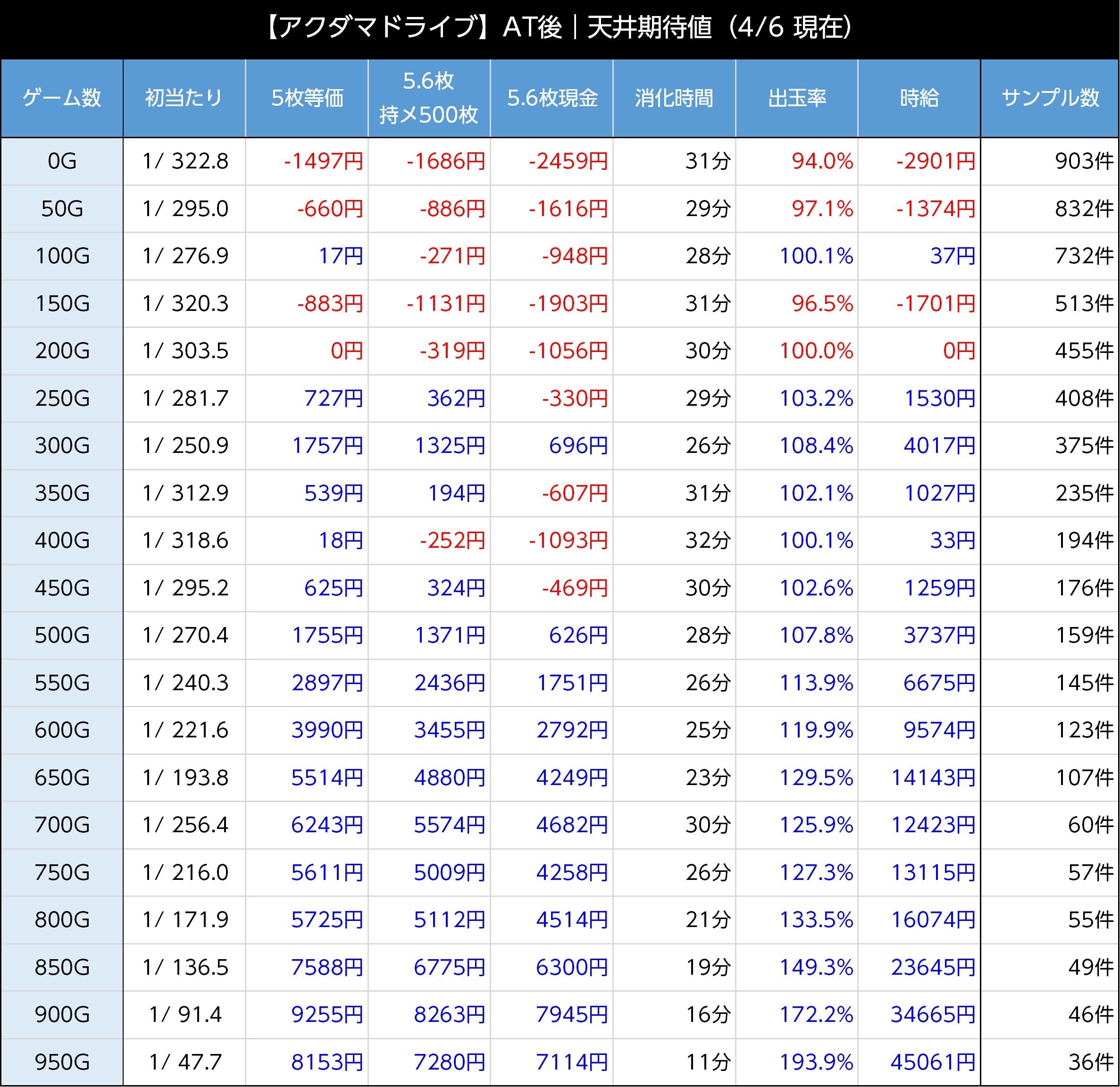 アクダマドライブスマスロの天井期待値は、等価交換は250G、5.6枚交換(現金)は500Gからプラス域です。1,000円以上の期待値を求める場合は、等価交換は500G、5.6枚交換(現金)は550Gから打ちましょう。