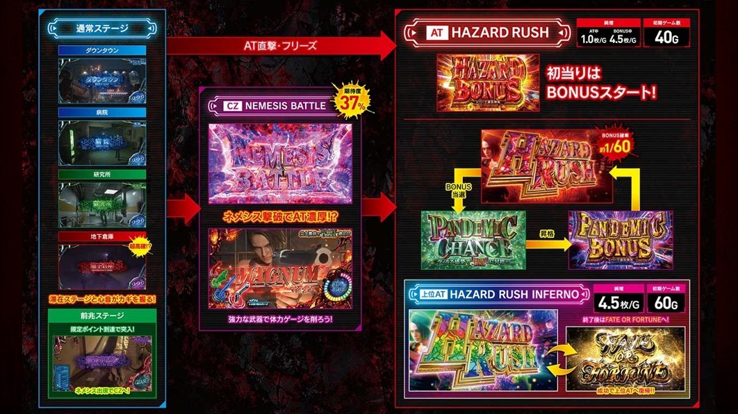 バイオRE3スマスロのAT中は、ボーナスとATのループで出玉を増やします。ボーナス当選率は滞在ステージで異なり、リプレイ成立時にステージアップ抽選を行うので、いかに内部状態を引き上げるかが重要です。