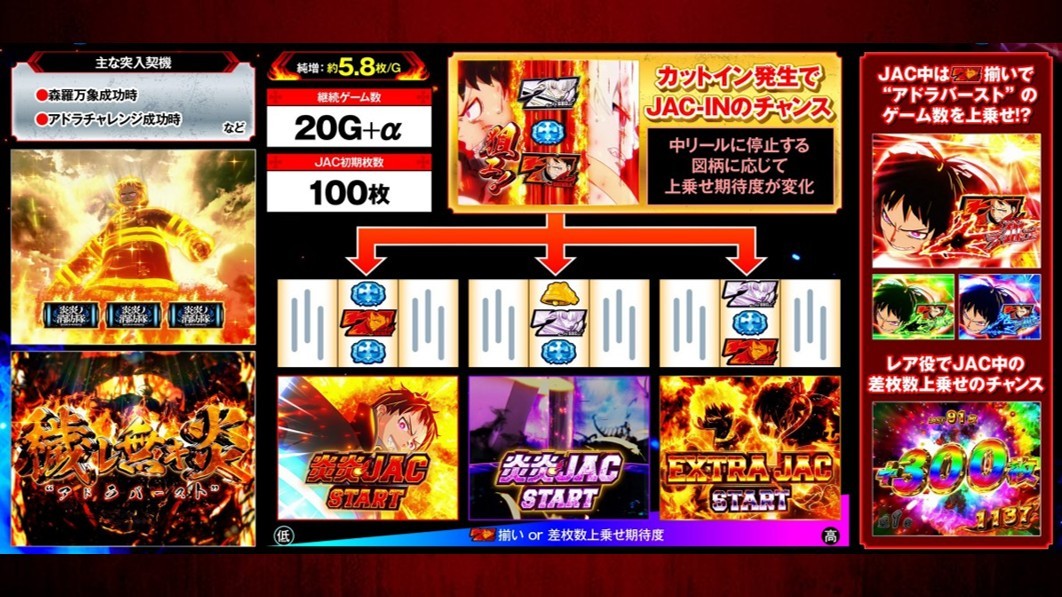 | 炎炎ボーナス | 獲得枚数約200枚 純増約5.8枚 リプ小Vが3連続以上で 森羅万象のチャンス 7揃い時にEXボーナス昇格で 1,000~3,000枚 |