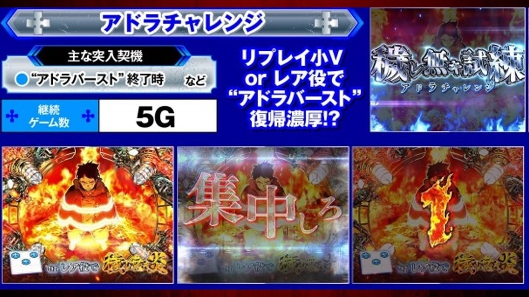 炎炎2スマスロのアドラバーストは、JAC-INの特化ゾーンです。消化中はJACが揃うほど出玉を増やせるので、大量出玉獲得に期待しましょう。また、消化後はアドラチャレンジによる引き戻しにも期待できます。