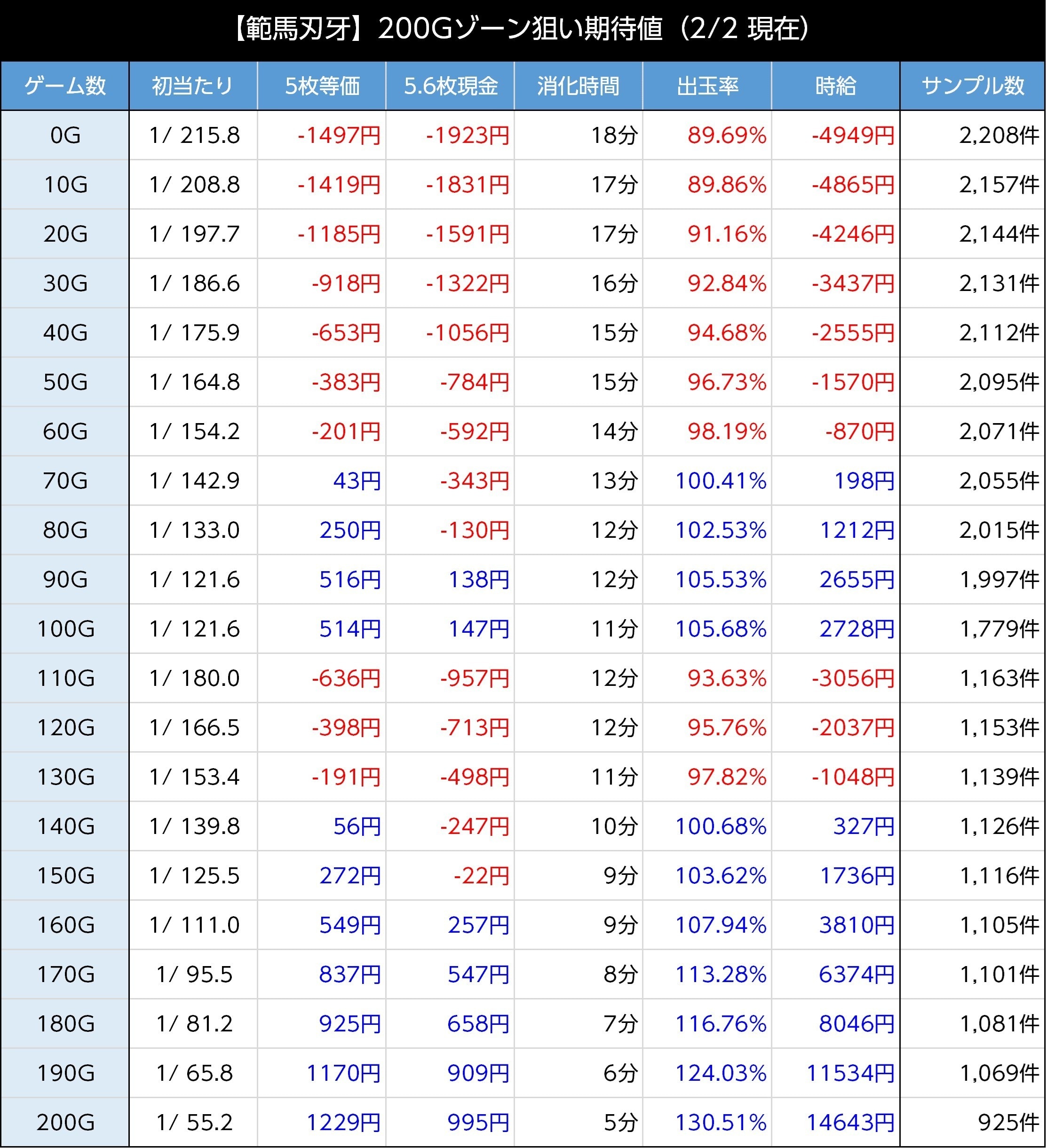範馬刃牙スマスロのAT後200Gのゾーン期待値は、等価交換は140Gから、5.6枚交換なら160Gからプラス域です。1,000円以上の期待値を狙う場合は、等価交換のみ190Gから打ち始めましょう。