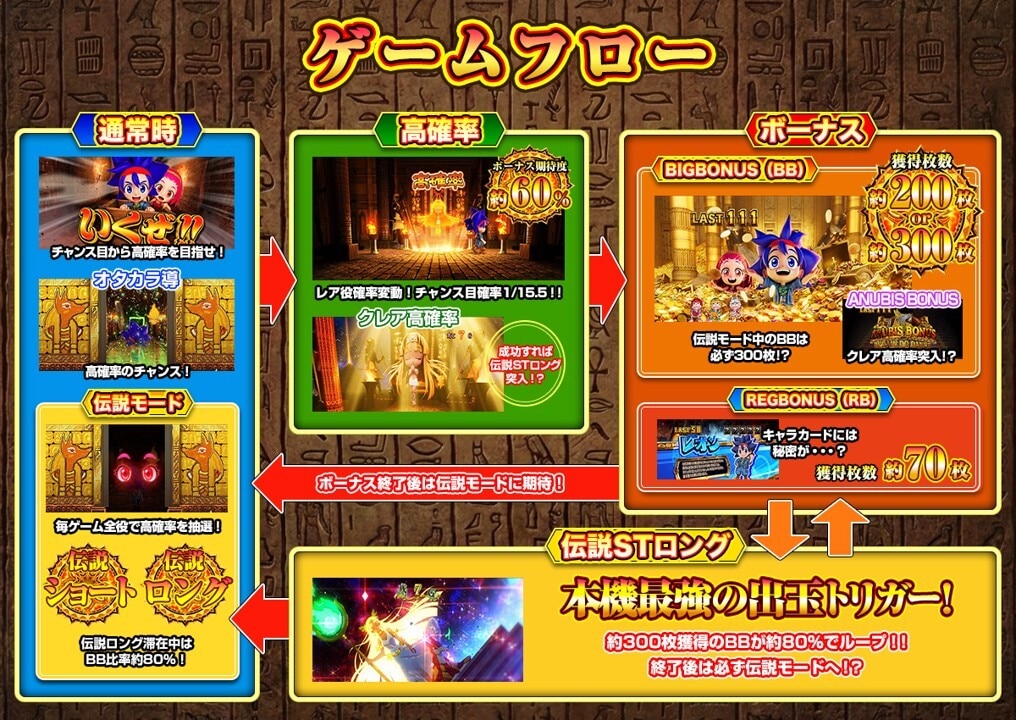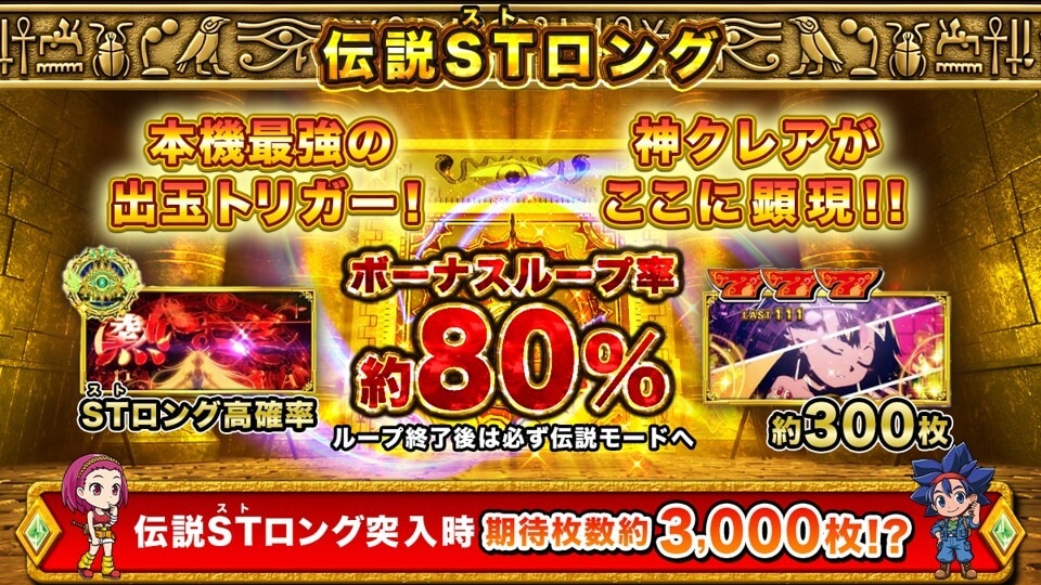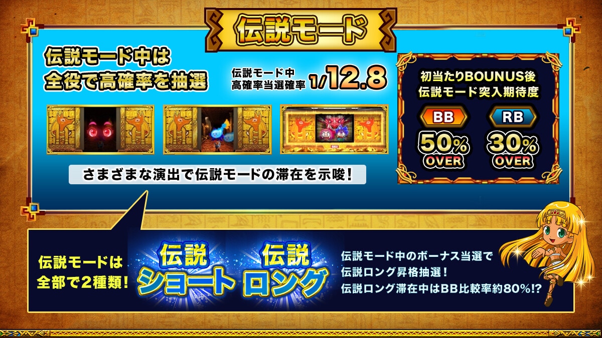 また、高確率の当選確率がアップする伝説モードも搭載されており、突入時は高確率とボーナスのループに期待できます。伝説モードには、高継続に期待できる伝説ロングがあるため、突入すれば大量出玉も夢ではありません。